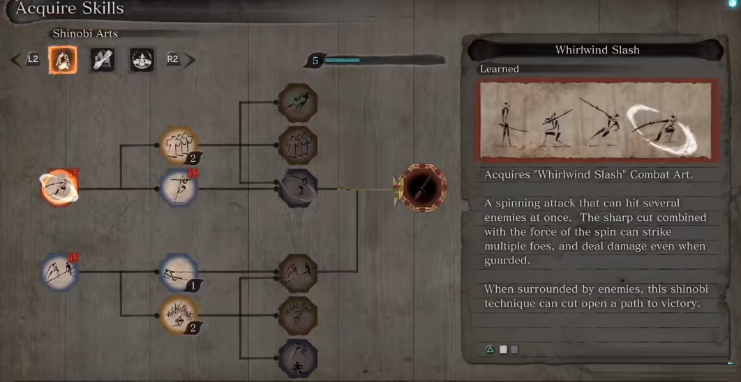 本作以技能樹形式來升級技能,類似RPG技能樹系統(tǒng)。主要有三類:忍者技能、義手技能和武士技能。PS:還有特別的“技能書”掉落系統(tǒng)