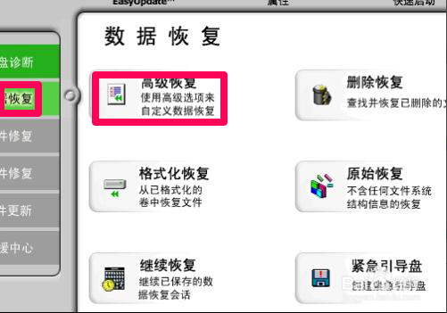 首先我們啟動EasyRecovery程序,在左窗口中找到數據恢復,并依次選擇“數據恢復”“高級恢復”選項。