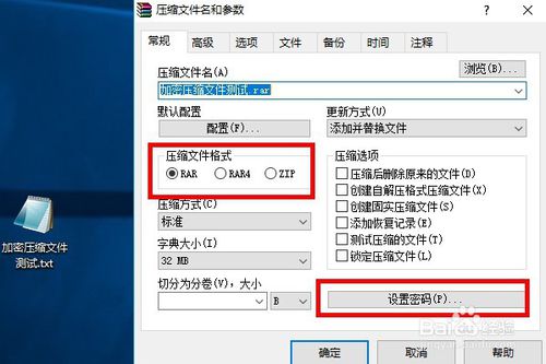 4、這里可以看到我們?cè)趬嚎s過(guò)程中可以選擇要壓縮完文件的格式,這里默認(rèn)就好,看右邊有個(gè)“設(shè)置密碼”的選項(xiàng),我們點(diǎn)進(jìn)去。