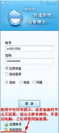A8: 使用中有異常提示,或者加速時節(jié)點(diǎn)無流量,請點(diǎn)擊ET登陸界面下方的修復(fù)網(wǎng)絡(luò),并重啟電腦,之后再使用ET。