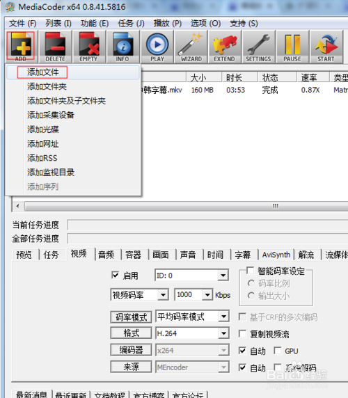 打開mediacoder軟件,點(diǎn)擊add增加需要壓制的視頻文件