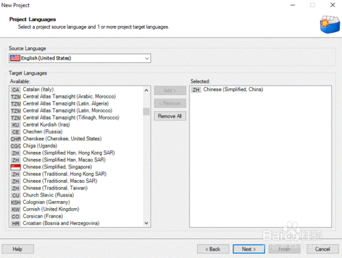 在彈出的“項(xiàng)目語(yǔ)言(Project Language)”中,選擇項(xiàng)目的“源語(yǔ)言(Source Language)”及“目標(biāo)語(yǔ)言(Target Languages)”,點(diǎn)擊“添加(Add)”,設(shè)定好后,點(diǎn)擊“下一步(Next)”。