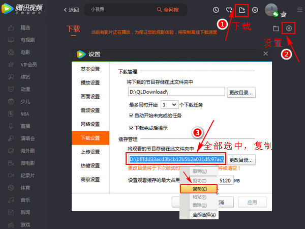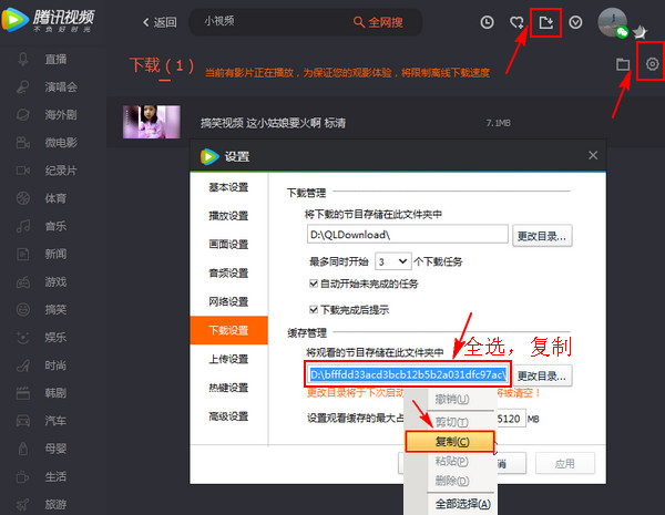 5、視頻下載完成后點(diǎn)擊騰訊客戶端的“下載”按鈕,接著在下載界面點(diǎn)擊“設(shè)置”按鈕,然后在彈出的對(duì)話框中全部選中并復(fù)制“緩存管理”下面的地址??梢杂覔粼摰刂?,在彈出的菜單中選擇復(fù)制,也可以用快捷鍵“Ctrl+C”進(jìn)行復(fù)制。和之前上面的操作是一樣的。