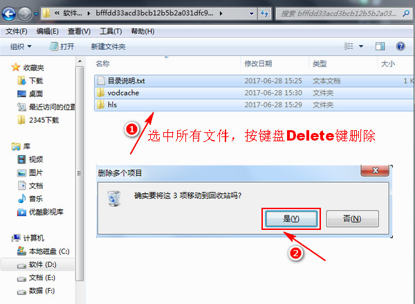 3、現(xiàn)在打開了一個(gè)新的界面,該界面顯示的就是騰訊視頻客戶端所有的緩存文件,我們把這些文件全部選中,然后按鍵盤上面的“Delete”鍵。這時(shí)會(huì)彈出一個(gè)提示框,我們直接點(diǎn)擊“是”。這樣就把所有的緩存文件都刪除了。