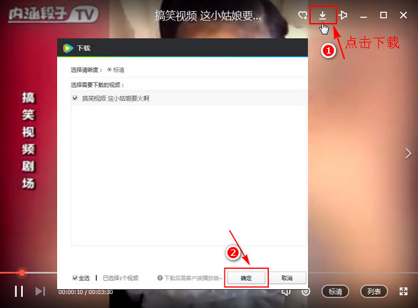 4、接著在騰訊視頻客戶端找到并播放要轉(zhuǎn)換的MP4的視頻文件,點(diǎn)擊界面右上角的“下載”按鈕。同樣會(huì)彈出一個(gè)下載的提示框,設(shè)置下載視頻的清晰度和要下載的視頻文件,設(shè)置好之后點(diǎn)擊“確定”即可。