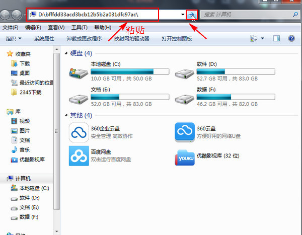 6、同樣打開電腦桌面上的“計(jì)算機(jī)”,把剛剛復(fù)制的地址粘貼到下圖所示的位置,粘貼快捷鍵:Ctrl+V。粘貼后點(diǎn)擊后面的“轉(zhuǎn)到”按鈕。