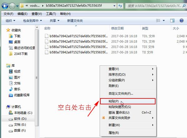 9、復(fù)制后回到緩存文件的文件夾下,在界面空白處右擊,在彈出的菜單中選擇“粘貼”,也可以用快捷鍵“Ctrl+V”進(jìn)行粘貼。