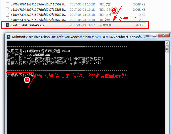 10、粘貼后就會(huì)發(fā)現(xiàn)在緩存文件下出現(xiàn)了一個(gè)qlv轉(zhuǎn)MP4格式轉(zhuǎn)換器,雙擊運(yùn)行該應(yīng)用程序,然后在彈出的界面中輸入轉(zhuǎn)換后的視頻文件名稱,但是文件名稱后面不能有.mp4,我這里輸入的名稱是騰訊轉(zhuǎn)MP4,大家可以自己進(jìn)行輸入,輸入好名稱后按鍵盤上面的“Enter”鍵。