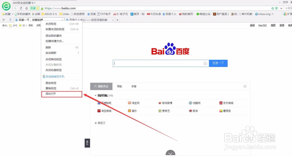 如果沒有,打開任意瀏覽器進(jìn)行,下面以360瀏覽器為例,打開360瀏覽器輸入你要訪問的網(wǎng)頁這里用“www.baidu.com”,右鍵->用IE打開,如圖所示;