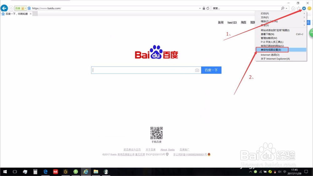 開啟IE后,選擇右上腳“齒輪”樣式圖標(biāo),打開設(shè)置界面,選擇“兼容性視圖設(shè)置”如圖所示;