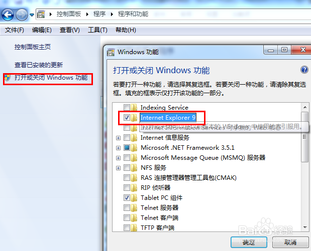 去掉internet explorer9 瀏覽器前面的鉤,點(diǎn)擊確定即可。就關(guān)閉IE瀏覽器服務(wù)了