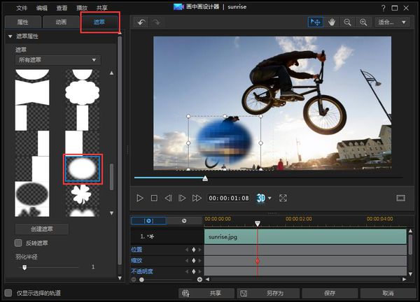 6、在彈出的窗口,點(diǎn)遮罩,選擇一個(gè)遮罩類型,羽化數(shù)值根據(jù)實(shí)際情況設(shè)置。設(shè)置好保存。如圖: