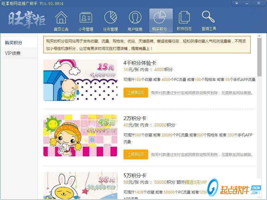 這個需要你根據(jù)自己使用情況選擇哦,如果你是需要發(fā)布收藏任務(wù)和非APP類流量任務(wù),那么是需要通用積分的,如果只發(fā)布APP流量,那APP流量積分卡肯定比較劃算,因為APP流量卡便宜些,能發(fā)得更多。當(dāng)然了2種積分卡你根據(jù)自己需要的量都買一點也是可行的,因為發(fā)布APP類流量時,系統(tǒng)是默認(rèn)先扣APP流量積分的,無積分可扣時,再扣通用積分。