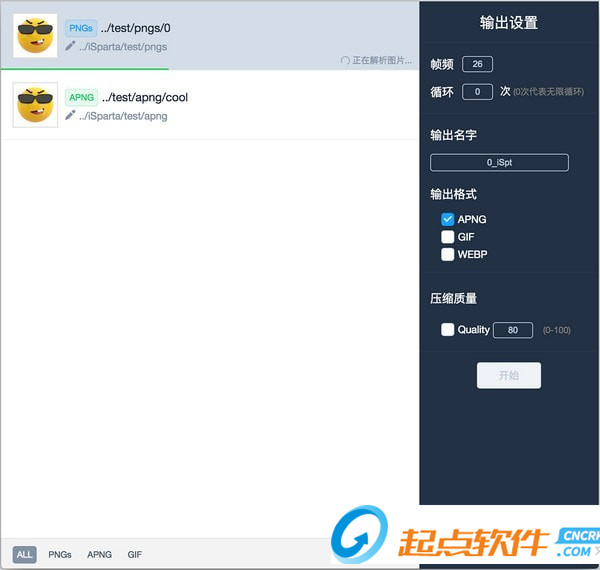 PNGs轉(zhuǎn)換APNG將多張PNG合并成一個APNG動圖,可以設(shè)置幀頻率、循環(huán)次數(shù)等參數(shù)。要求PNG在同一目錄下,并且保持文件名標準化(1.png, 2.png...)