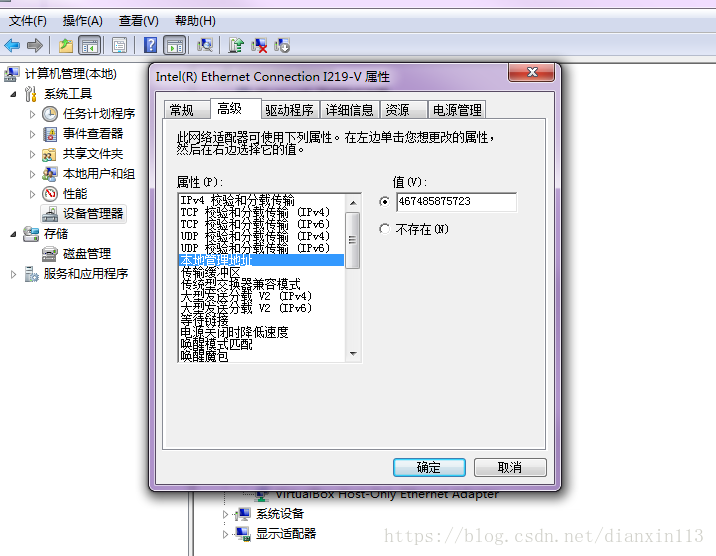 3、修改網(wǎng)卡地址。我的電腦->管理->設(shè)備管理器->網(wǎng)絡(luò)適配器。選擇列表中正確的一項:如Realtek PCIe GBE Family Controller->屬性->高級->網(wǎng)絡(luò)地址,在值選項中輸入任意一個12位數(shù)字,如:111111111111,點(diǎn)擊確定。