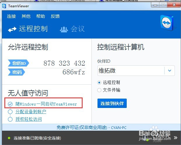 打開TeamView,在無人值守這里勾上,隨Windows一同啟動TeamView。這個類似于開機(jī)自動啟動。