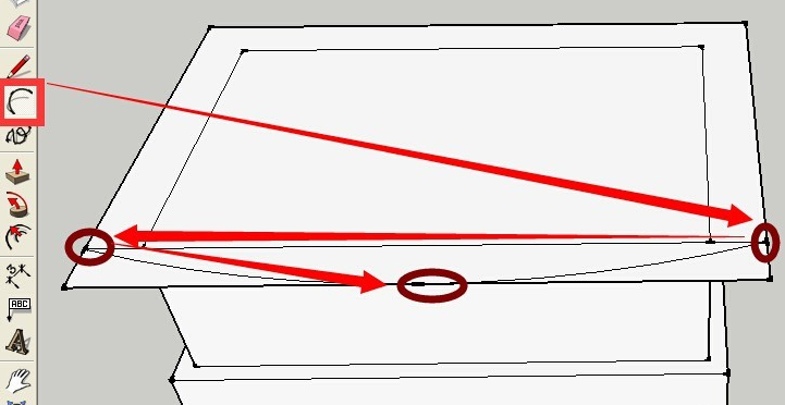 用圓弧工具先后點(diǎn)按箭頭所示的兩點(diǎn) 然后在單擊最后一個(gè)箭頭所示的位置 形成一個(gè)圓弧 效果如下圖所示