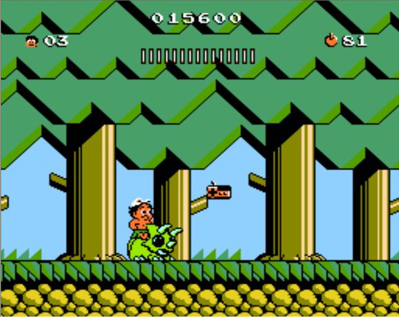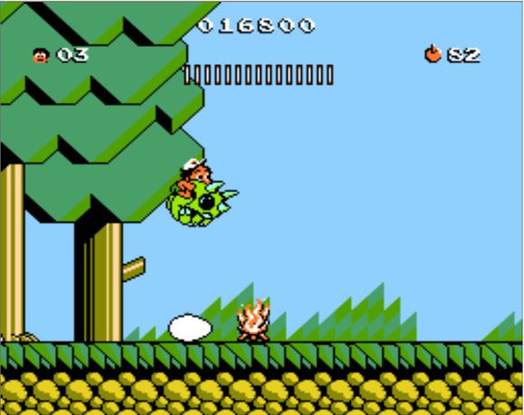 1-3:大樹林,8血。出場可以只騎龍帶回旋鏢,或者只帶回旋鏢,因為會馬上撿到一個斧頭,不然就是1000分的花。第一個蛋是斧頭或者花;第二個火堆后面的第二個蛋是無敵小蜜蜂;第三個蛋在第四個火堆后面,里面是五角星-三角龍,前面是一個彈簧,用來吃水果;