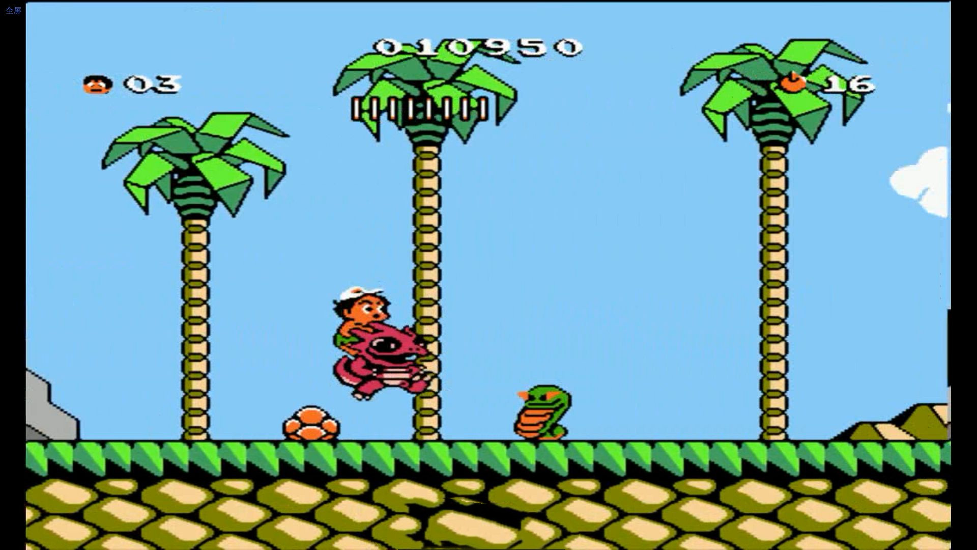 2-1:洞穴1,11血,騎火龍不帶武器,出來兩只跳跳蝦,一只幺蛾子,再一只跳跳蝦,后面兩只幺蛾子,會一下從上面飛下來,要小心;第一個蛋是回旋鏢,跳第二個溝溝的時候又一只幺蛾子沖下來,要小心(也可以直接騎著龍躲進溝里);再往前走到第一個下面有巖漿的平臺,攻擊一下有隱藏門-選蛋游戲;然后過第二個平臺,打掉一個骷髏,后面是第二個蛋,里面是黑桃-噴火龍;等平臺掉下去,然后到一個巖漿瀑布,上面有兩個骨刺平臺,踩上去會掉的那種,還好有火龍不怕,跳上第一個平臺打掉幺蛾子,然后跳上第二個平臺吃水果,或者直接上岸也行,跳的時候不注意骨刺會把龍打掉;通關(guān)。)