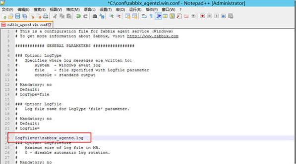 2、找到conf下的配置文件zabbix_agentd.win.conf ,修改LogFile、Server、ServerActive、Hostname這四個(gè)參數(shù)。具體配置如下: