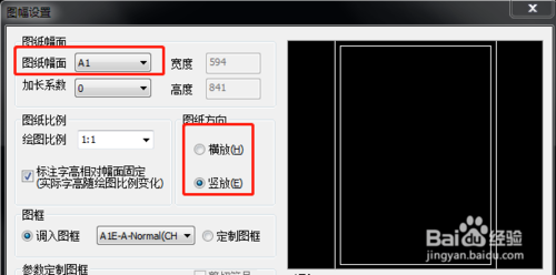 在里面,我們一般可以先對(duì)圖幅的規(guī)格進(jìn)行設(shè)置,有A4-A0幾種常規(guī)選擇,還可以自定義圖幅,此外,還可以選擇圖幅的方向。