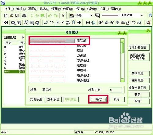 顏色設(shè)定好以后點(diǎn)擊線型,設(shè)置線型窗口出現(xiàn),在窗口上面選擇需要的線型點(diǎn)擊下面的確定按鈕