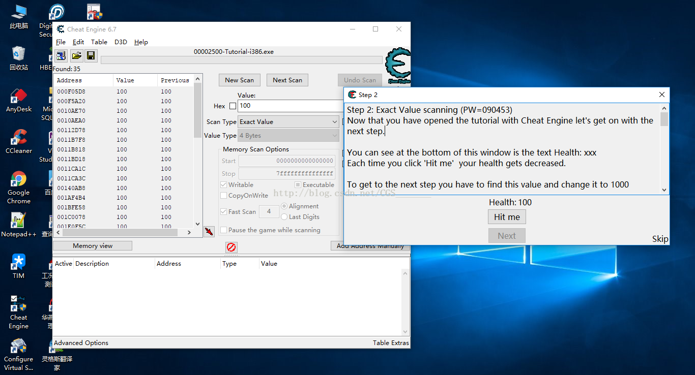 a)在CE的Value值中填入100,注意不要勾選HEX復選框,點擊First Scan第一次掃描,這時候會發(fā)現(xiàn)CE左側(cè)有很多個Address地址,但是我們不知道哪一個Address是血量Health的地址