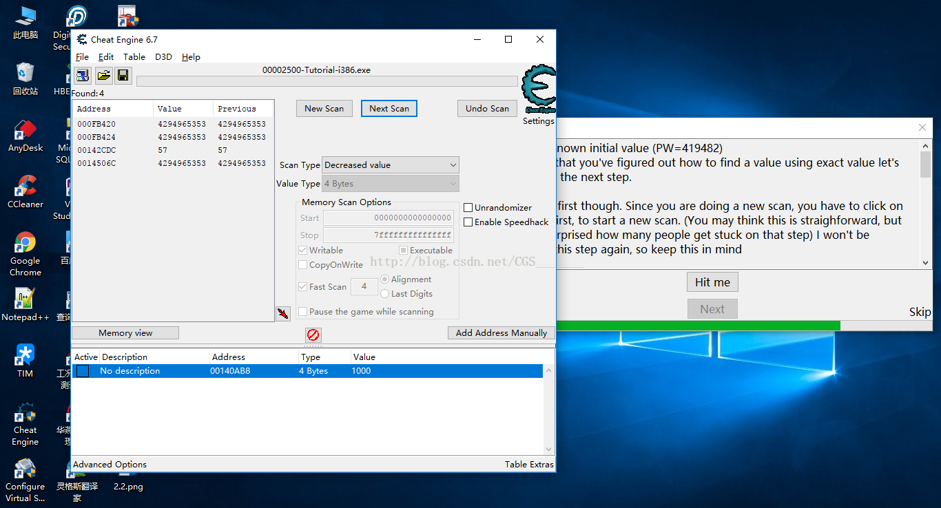 b)進行上一步未知的第一次掃描后,點擊Hit Me減少生命值,然后返回CE將Scan Type置成“Decreased value”也就是將掃描類型換成減少值掃描,點擊Next Scan繼續(xù)掃描我們會發(fā)現(xiàn)CE左側(cè)會出現(xiàn)許多Address,如下圖所示: