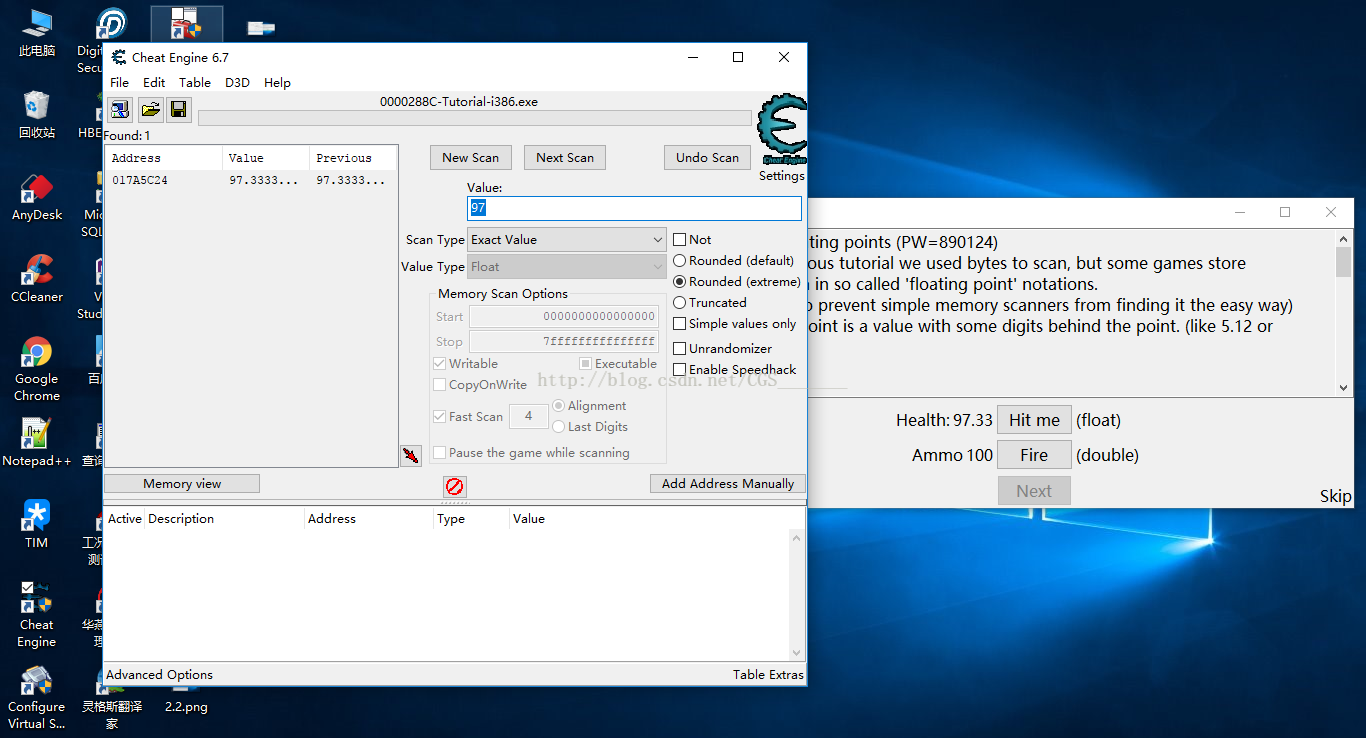 b)繼續(xù)點擊Hit Me按鈕,然后在CE中點擊Next Scan繼續(xù)掃描,這時我們會發(fā)現(xiàn)CE左側(cè)只剩一個Address了,這個地址就是我們要找的血量的地址