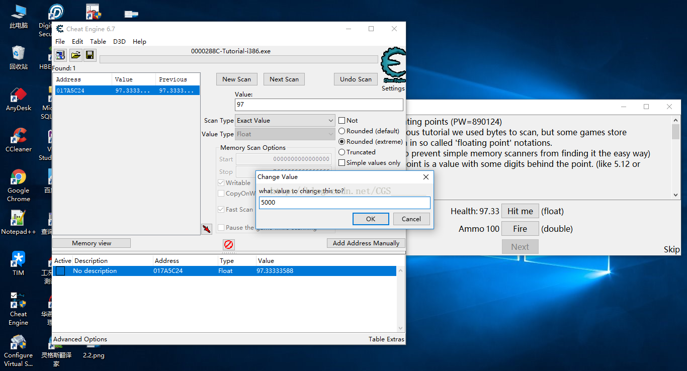 這一關(guān)的目的是讓我們了解有些游戲或程序的數(shù)據(jù)存儲的“Value Type”不是“4 Bytes”,而是“Float”、“Double”這種單/雙精度浮點值。這一關(guān)與Step 2類似,只是修改了"value Type"類型進行了兩次掃描(一次float單精度,一次double雙精度掃描)。通關(guān)條件為將Health和Ammo都修改成5000,具體步驟不再描述,見下圖: