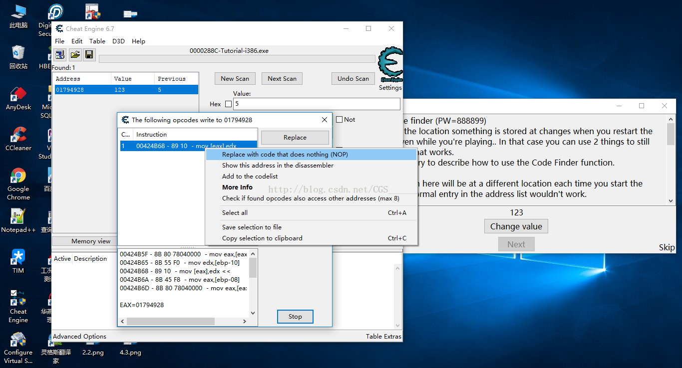 c)點擊“Change value”按鈕并且窗口列表中的代碼出現(xiàn)后,我們鼠標右鍵這行代碼選擇“Replace with code that does nothing(NOP)”將這行代碼無效化,彈出窗口選擇OK然后通關(guān),如下圖所示: