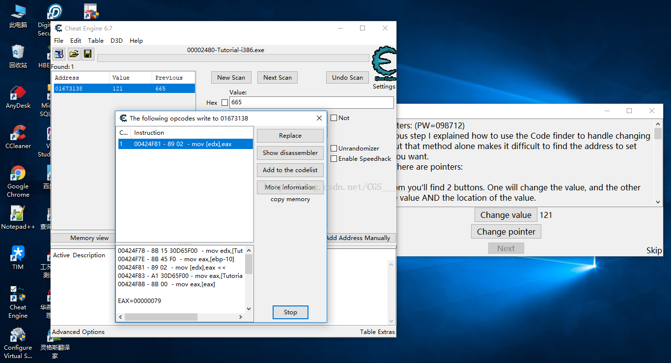 這一關(guān)的目的是讓我們尋找更改值的代碼,然后將其這段代碼無效化從而達到不能改變值的目的。這可以應用到在游戲中使怪物攻擊無效生命值不變,彈藥不變等等。通關(guān)條件就是使代碼無效不能Change Value改變值,步驟如下:
