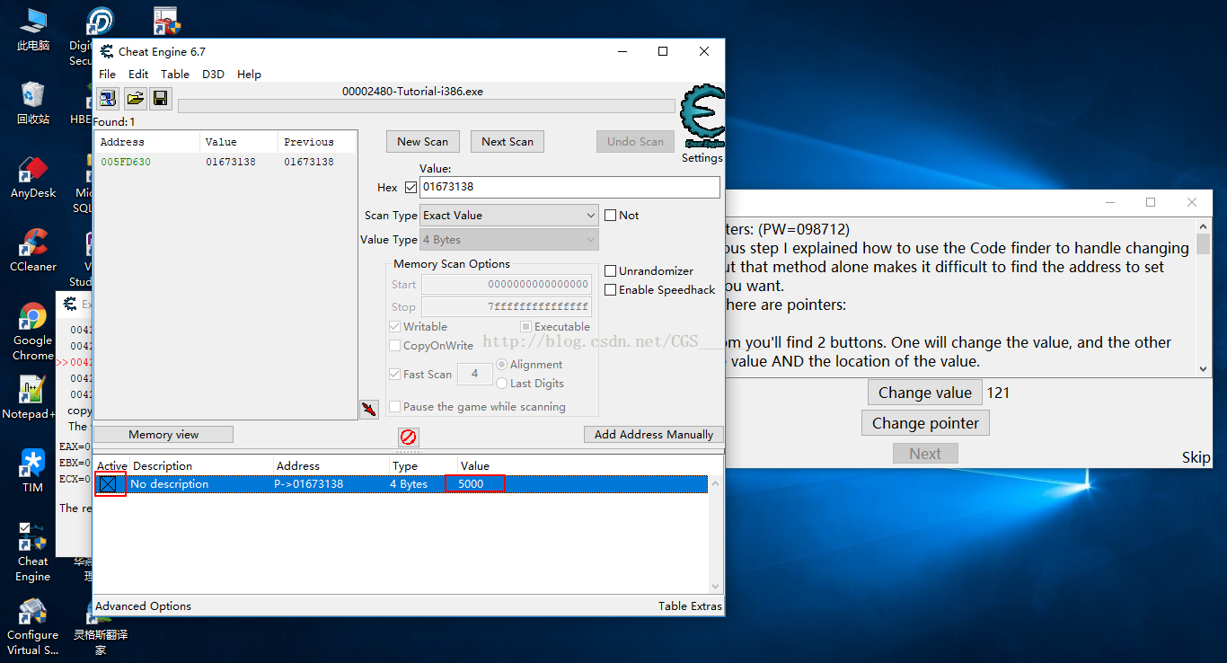 c)完成上一步后我們發(fā)現(xiàn)CE主界面下方的列表中多出一個我們剛才手動添加的地址(注意Address列多出一個P->,這代表指針的意思),雙擊value修改value值,然后鼠標單擊Active鎖定這個指針,這時候回到教程中點擊Change pointer過關(guān),如下圖: