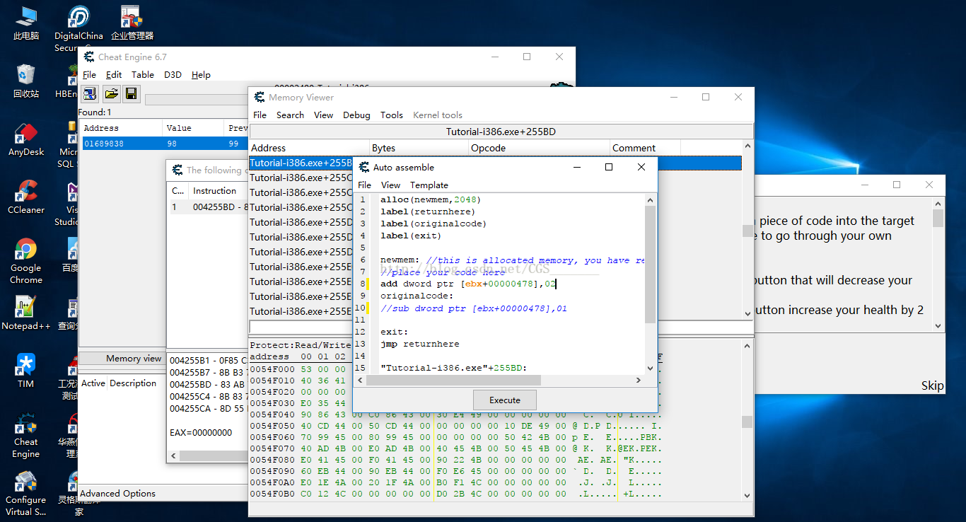 這一關(guān)的目的是讓我們學會如何注入代碼(匯編語言),使用注入代碼來修改程序或游戲中的數(shù)據(jù)。例如本關(guān)中每點擊一次“Hit Me”按鈕,生命值“Health”會較少1,我們知道他的攻擊力為1,本關(guān)的通關(guān)條件是當我們每點擊一次“Hit Me”生命值“Health”增加2,具體操作步驟如下: