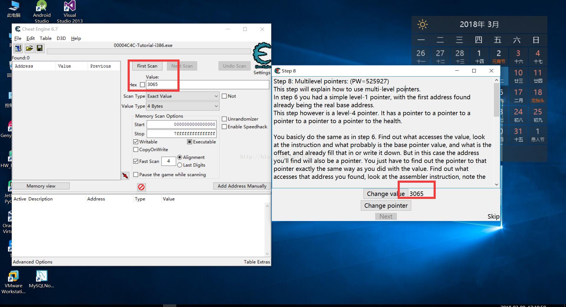 這一關(guān)的目的是讓我們學會如何查找多級指針,通過Step6我們了解并尋找了一個一級指針,Step8中的指針為四級指針,有四個偏移(每臺計算機上的偏移量可能不同)。通關(guān)條件是尋找到這個多級指針改變其值為5000并且凍結(jié)指針活動。