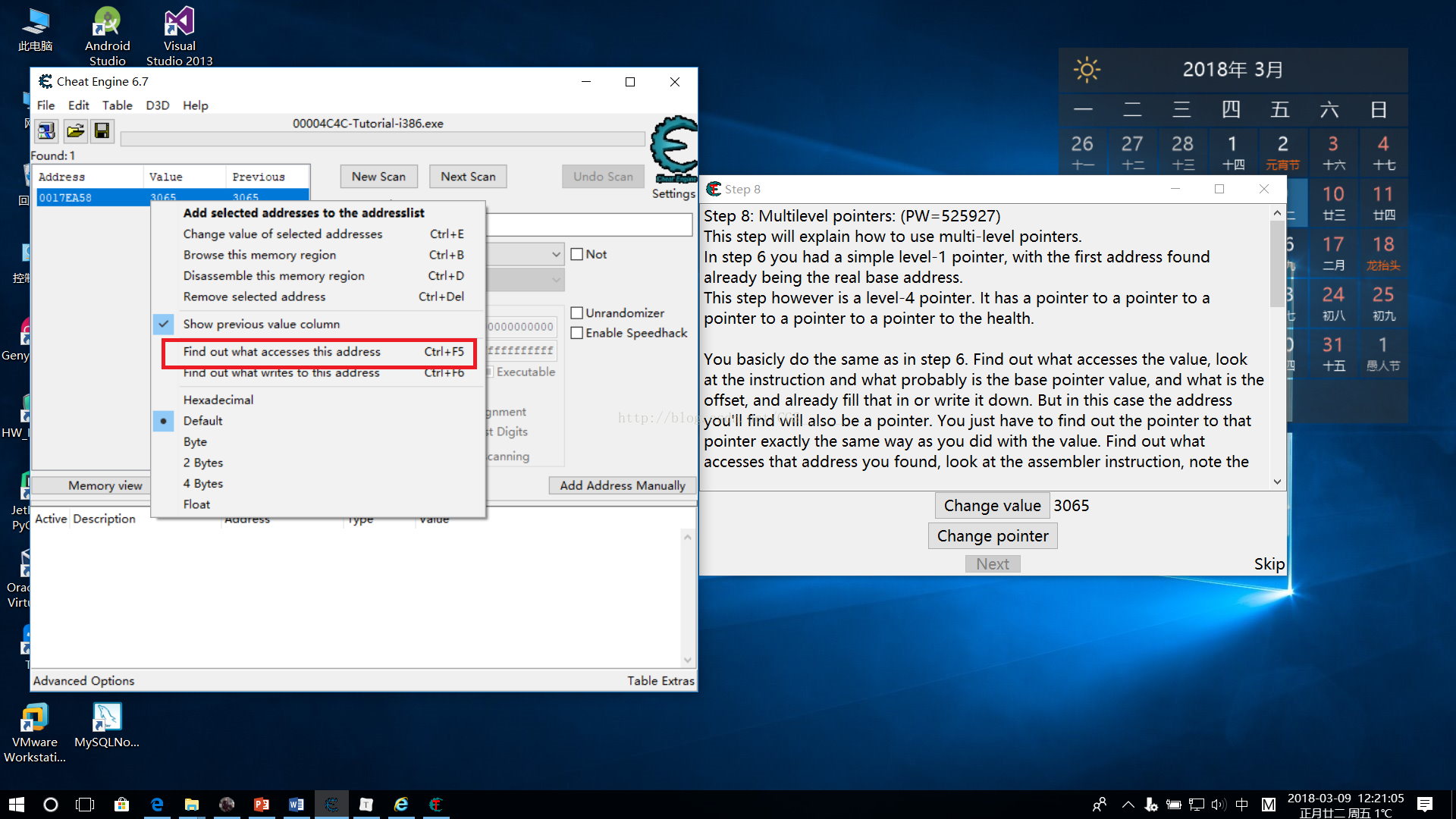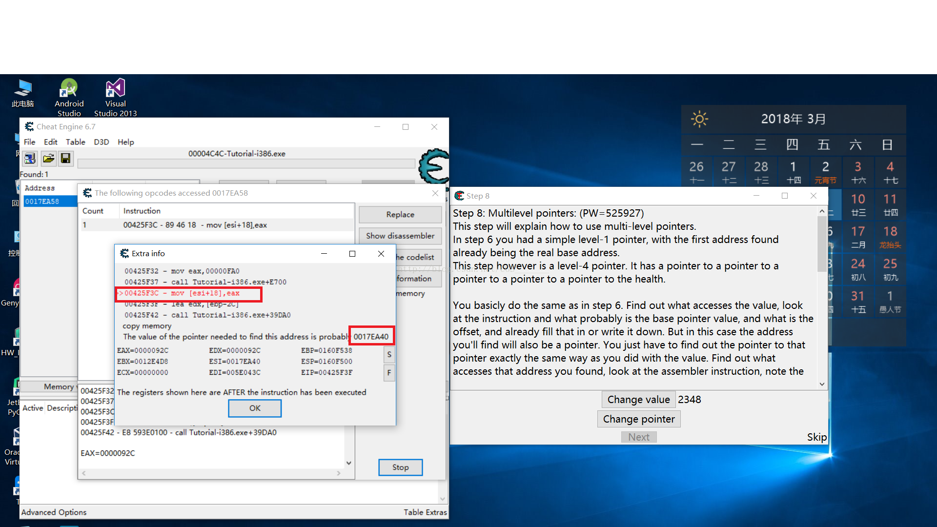 c)點擊“Change Value”按鈕,雙擊代碼彈出“Extra info”窗口記下偏移值和可能的地址,下圖的偏移值是18,可能的地址是0017EA40,在不同計算機上找出來的地址和偏移可能不一樣。重復同樣的步驟,就像Step6中一樣,直到找到這個指針的基址。找到最后,基址的顏色變綠。