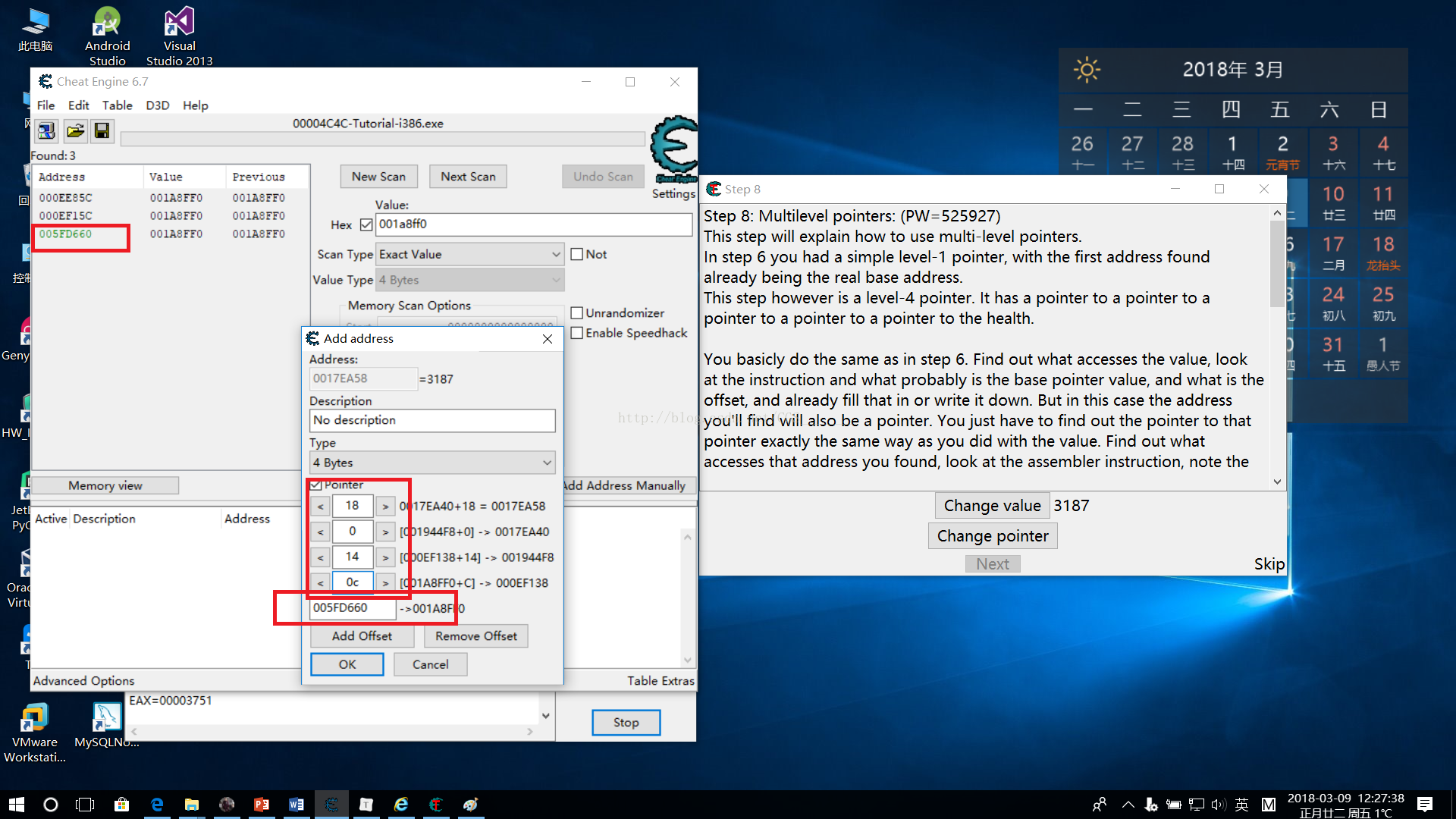 d)手動添加地址,勾選pointer復選框,將基址和上一部中我們記錄的每級指針的偏移量填入,修改指針value并凍結(jié)active,過關(guān)。