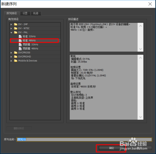 在新建序列中,一般默認選擇,也可以根據(jù)自己的需要選擇,最后點擊確定