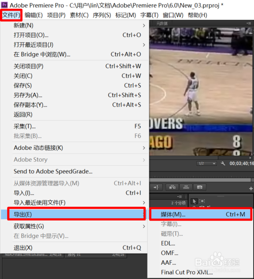 最后導出視頻,點擊【文件】,之后點擊【導出】,最后點擊【媒體】