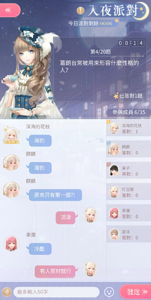 入夜派對是閃耀暖暖聯(lián)盟日常玩法之一,每天晚上19:00聯(lián)盟成員聚集在一起答題,成員們要在10分鐘內(nèi)快速回答問題,若聯(lián)盟成員答對指定題數(shù),則所有參與參與的成員都能獲得豐富獎勵(聯(lián)盟幣+金幣)。