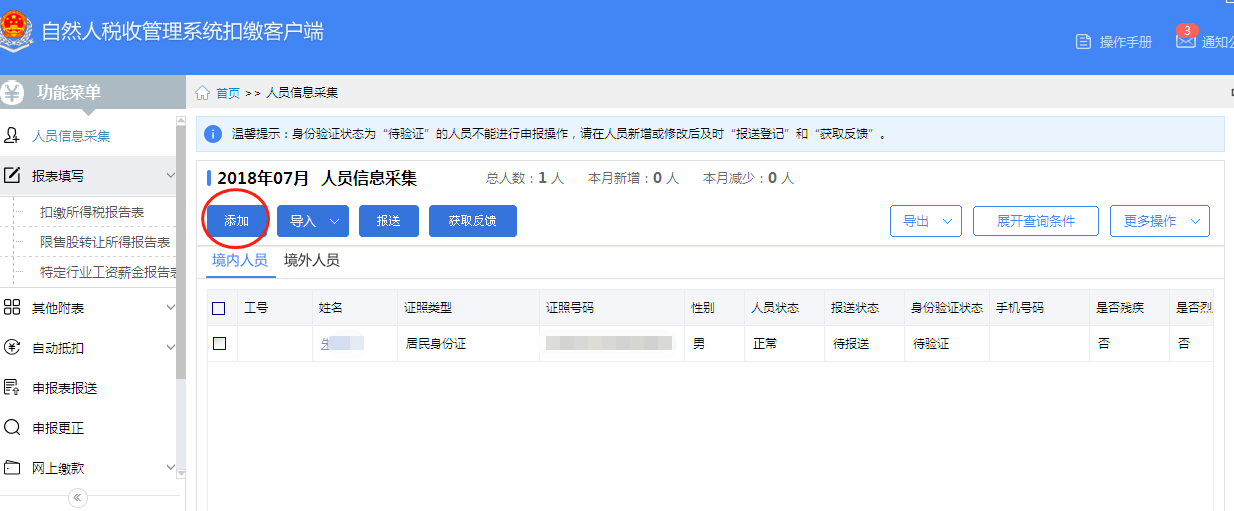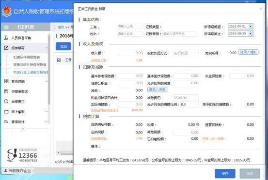 選擇“人員信息采集”,添加人員信息成功后填寫報(bào)表,選擇“扣繳所得稅報(bào)告表”進(jìn)入“正常工資薪金”,直接點(diǎn)擊“添加”按鈕錄入明細(xì),收入選擇“0”填寫即可。