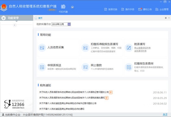 9、“自然人稅收管理系統(tǒng)扣繳客戶端”支持一臺電腦申報(bào)多個(gè)企業(yè)或單位的個(gè)人所得稅,通過軟件右上角“企業(yè)管理”菜單添加多個(gè)企業(yè)或多個(gè)扣繳單位切換申報(bào)。