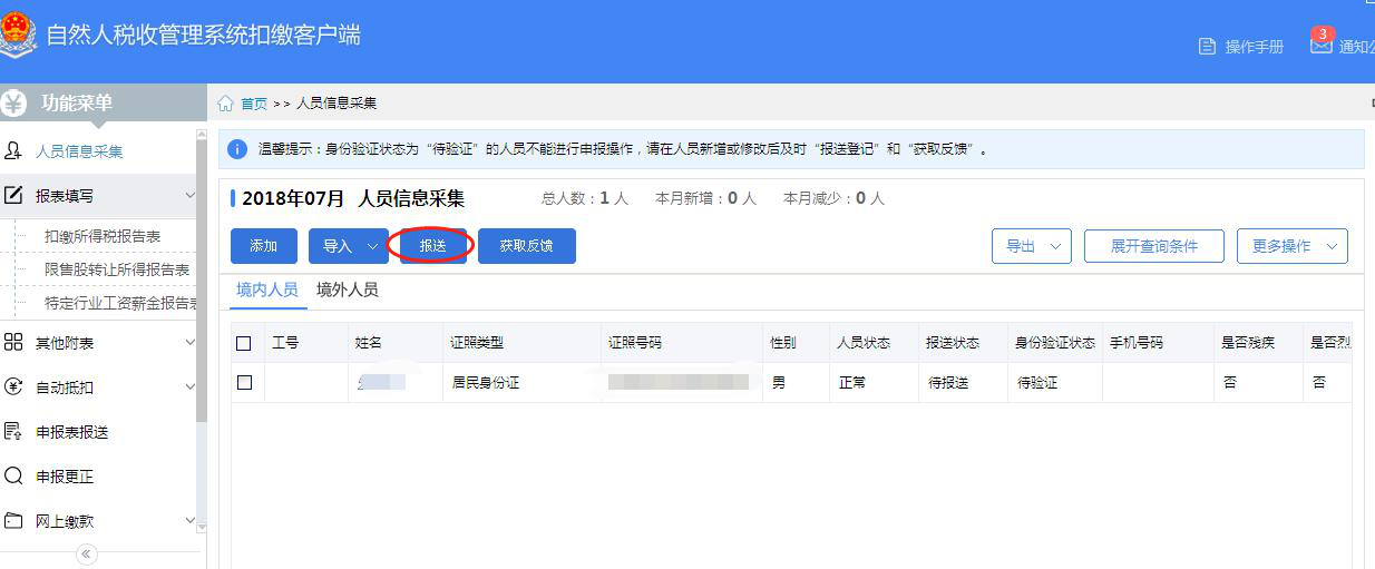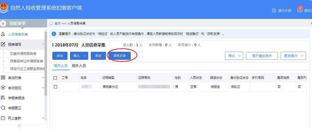 特別注意:新的個(gè)稅扣繳系統(tǒng)和公安系統(tǒng)聯(lián)網(wǎng),新增自然人身份信息比對驗(yàn)證功能,申報(bào)之前需先報(bào)送人員信息和獲取人員信息反饋,否則將無法申報(bào)個(gè)稅,這是新流程區(qū)別于舊流程之處。如下圖所示: