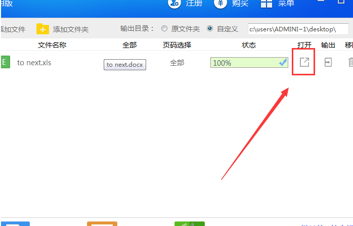 4、等待文件轉(zhuǎn)換完成,如果小伙伴們想要對(duì)轉(zhuǎn)換后的Excel表格進(jìn)行查看,那么可以點(diǎn)擊迅捷pdf全能轉(zhuǎn)換器破解版界面當(dāng)中的“打開(kāi)”選項(xiàng),進(jìn)行查看。