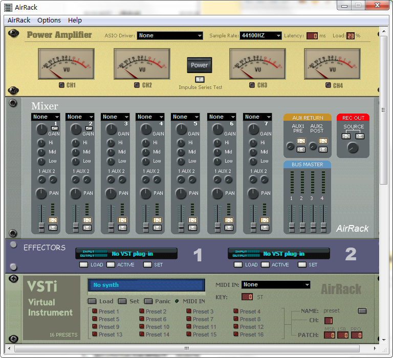 AirRack中文版是一款相當(dāng)不錯的音頻控制工具;它擁有完整的現(xiàn)場氣氛、現(xiàn)場音樂的各種效果解決方案,而且還將許多的功能進(jìn)行集中,包括了調(diào)音臺、VSTI虛擬樂器等;軟件可以讓用戶通過一臺電腦、一個簡單實(shí)用的MIDI鍵盤,就可以使用音樂來對您的現(xiàn)場進(jìn)行控制,感興趣或者需要的朋友趕快來本站將AirRack(音頻控制軟件)下載使用吧!