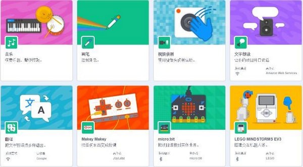 (2)2.0中更多積木分類下的添加擴展,作為一個大類單獨分離出來。而版本2.0中的畫筆、音樂演奏、視頻偵測等相關分類及指令都作為了擴展模塊,用戶需要點擊添加擴展才可以使用;