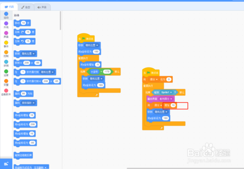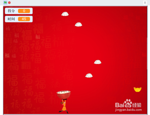 在角色區(qū)右鍵選擇復制,將餃子角色多復制幾個吧。為了增加游戲的趣味性, 將其中一個餃子角色造型換成元寶,得分設置設為10分,得分音效更酷炫。代碼如圖;