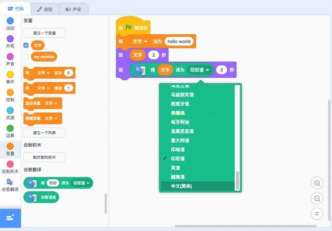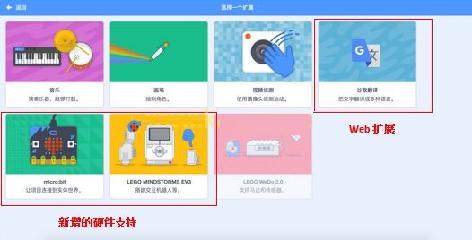 (3)Scratch3.0新增對硬件micro:bit、LEGO MINDSTORMS EV3的支持,可以讓項目連接到實體世界,搭建交互機器人等。除此之外還新增web支持(谷歌翻譯),可以將文字翻譯成多種語言;