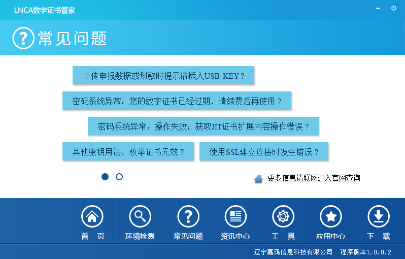 LNCA數(shù)字證書管家是一款優(yōu)秀的政務(wù)辦公軟件,用戶可以使用電子政務(wù)辦工,方便快捷,節(jié)省紙張,軟件還提供常見問題關(guān)鍵詞,可以快速查看相關(guān)解決方案。是電子政務(wù)好幫手。