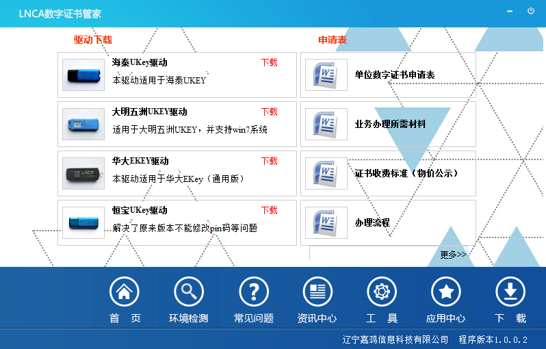 LNCA數(shù)字證書管家”提供驅(qū)動程序的下載功能,其中有證書相關(guān)應(yīng)用軟件、申請材料。